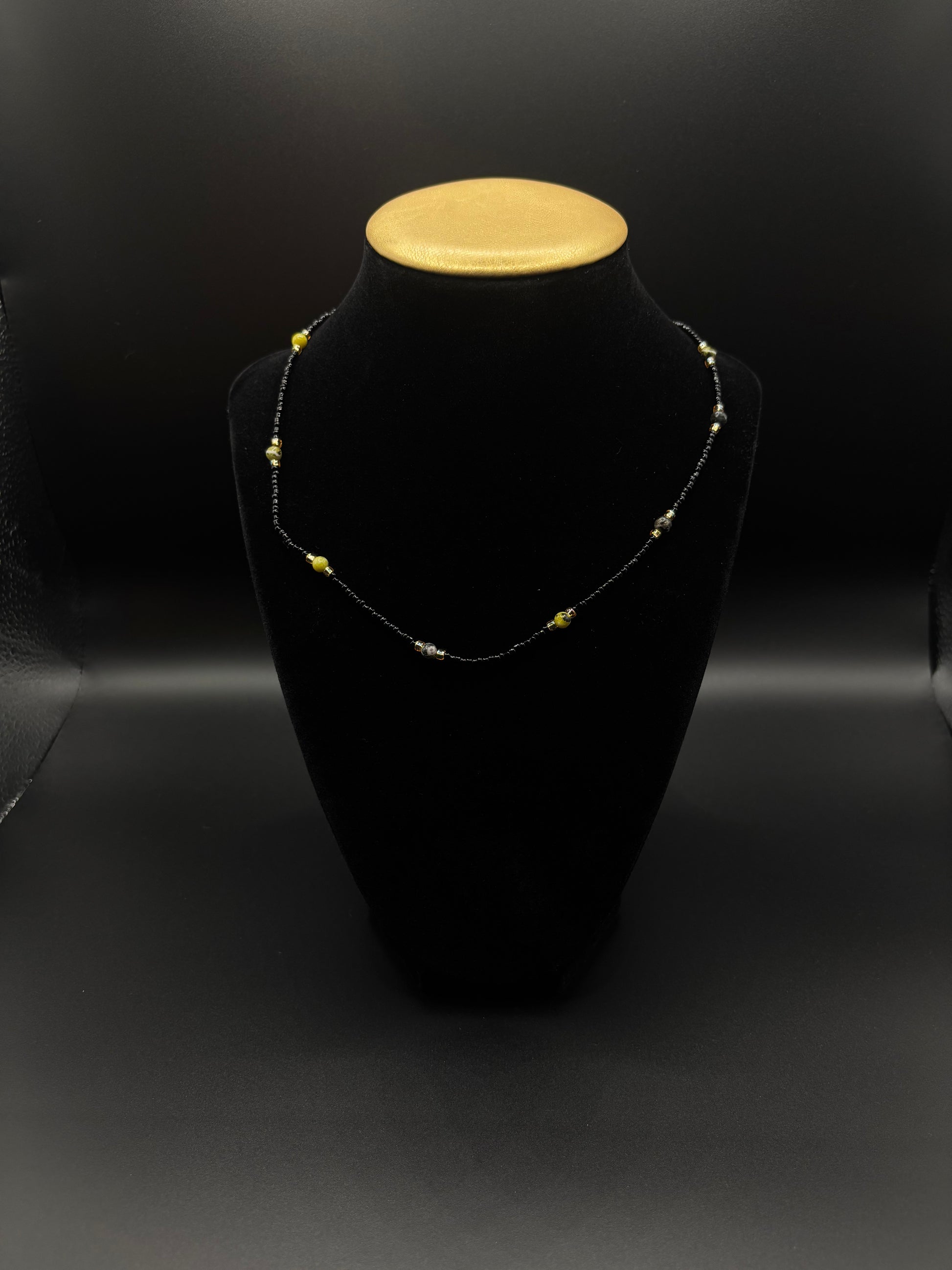 Elegant single strand choker. While simple a great addition to any one outfit. Black, gold and green beads that catches anyone’s sight.