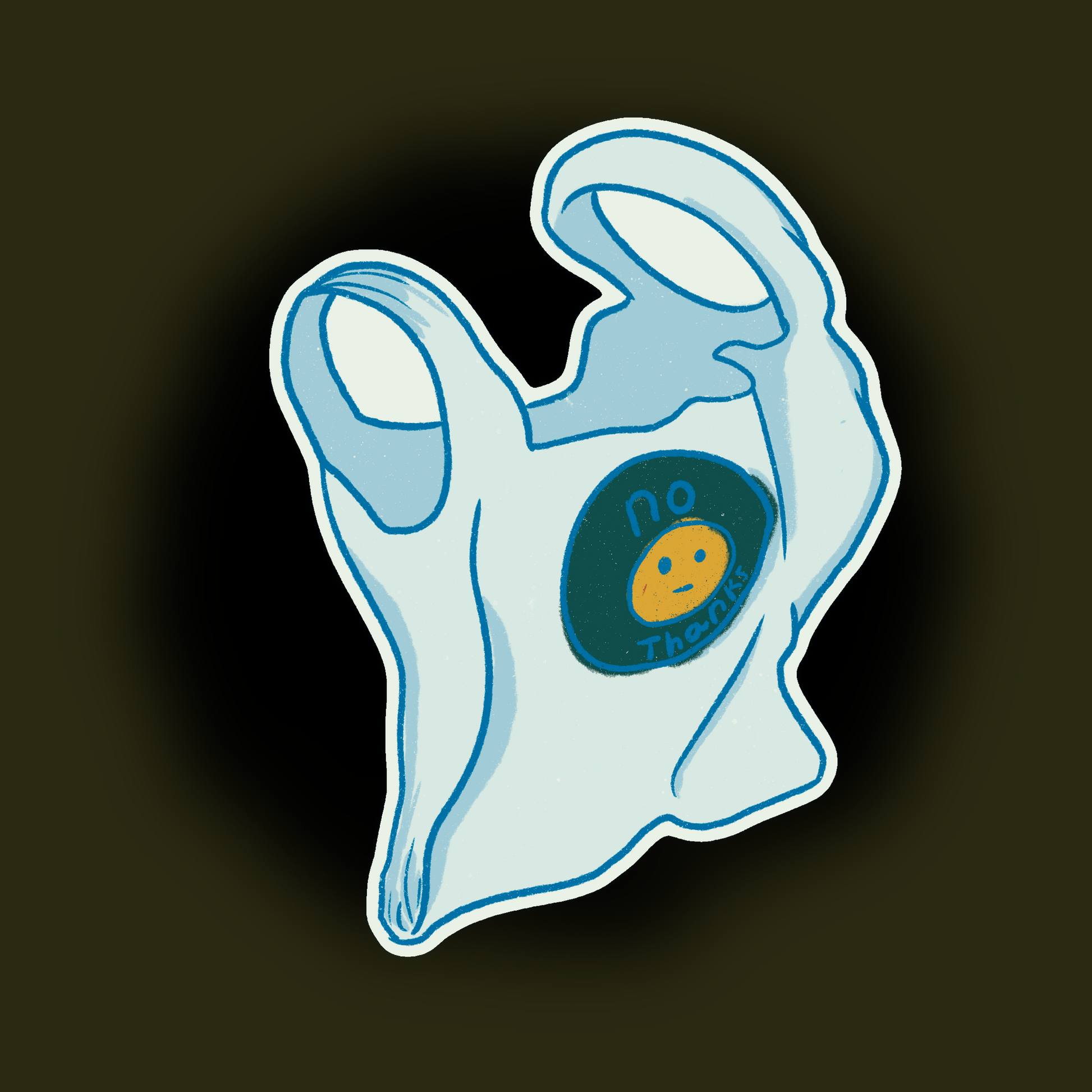 This sticker the Christman retail store experience, and I know it can relate to some of y’all. It’s a plastic bag. That says no thanks. It’s 3 inches tall 2 inches wide and It comes in A light blue color is more of a experimental sticker. It’s really partner with the take a sticker.